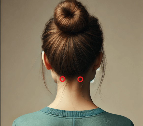 목 뒤쪽, 두개골 밑에 위치한 두 개의 움푹 패인 곳을 찾으세요. 이곳이 바로 풍지혈입니다. 양손 엄지를 이용해 이 부위를 천천히 눌러줍니다. 1분 동안 원을 그리듯 마사지해 주세요. 이 지압법은 목의 긴장을 풀어주고 두통을 완화하는 데 탁월한 효과가 있습니다. 제가 가장 효과가 큰 지압 부위인데요, 이 목부위와 귀 아래쪽 전체를 아래로 썰어주듯 부드럽게 마사지해줍니다 사실상 목의 전체를 만져준다고 생각하시면 쉬울 거예요, 특히 저 빨간 점 과 귀뒤쪽 부분을 지압해 주면 진짜 효과가 즉시 나타났어요.